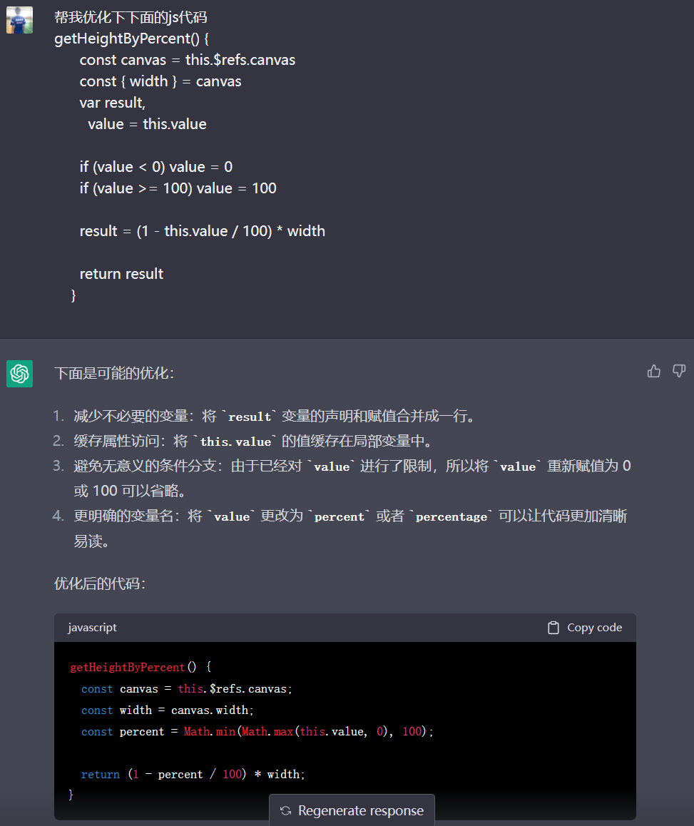 ok 这里还有一个点,其实我给它输入同一段demo代码,它给出的结果是不一样的,有些答案是不带 Math.min(Math.max(0, 1), 2),而是用了比较复杂的三元去解。所以,我感觉 chatGPT 是不会记录我们给它的问题,它更多的只是负责回答。(这个对于信息泄漏来说非常重要)